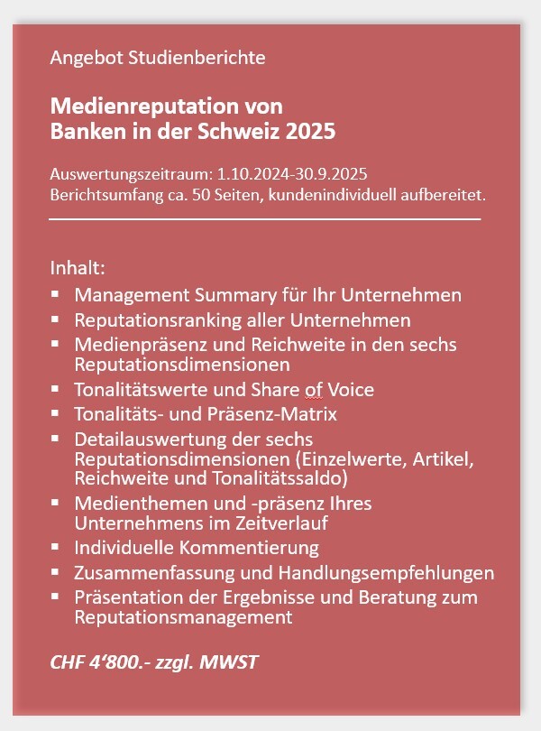 Die Benchmarkstudien der swissreputation.group in Kooperation mit pressrelations Schweiz bieten eine hervorragende Übersicht über die mediale Wahrnehmung führender Unternehmen in der Schweiz – jetzt bereits zum vierten Mal für den Bankensektor.