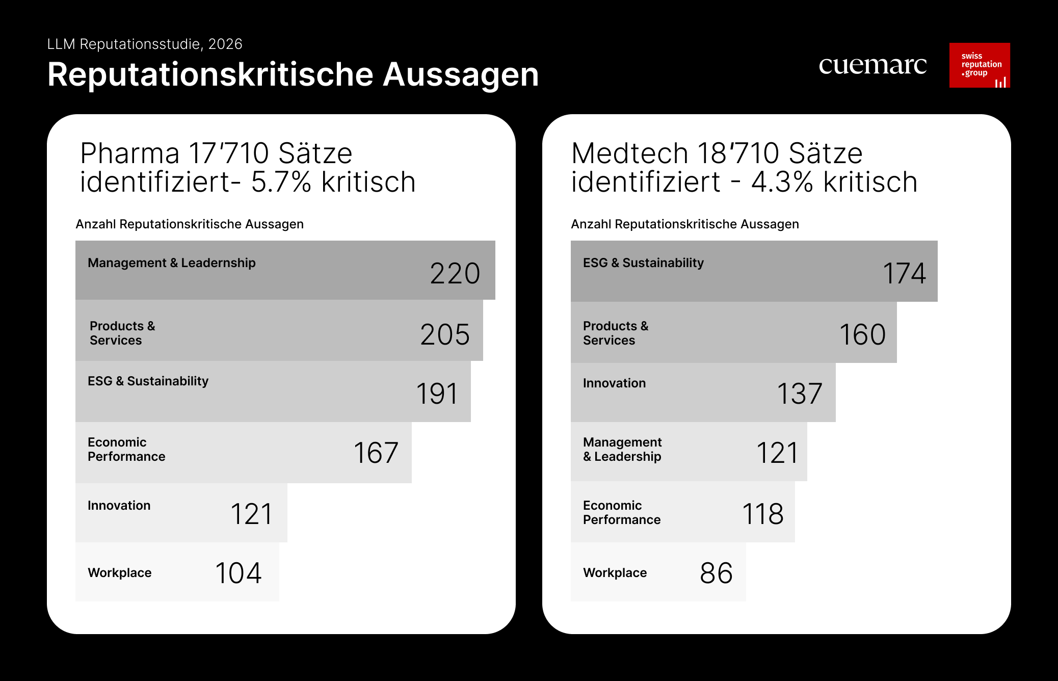 “Bei Pharma-Unternehmen entstehen die meisten reputationskritischen Aussagen bei Fragen zum Management, gefolgt vom Produktangebot und Nachhaltigkeitsthemen. Bei MedTech-Firmen konzentriert sich die Kritik hingegen vor allem auf ökologische Fragestellungen sowie auf das Produktangebot”, so Pamela Gottsponer, Co-Founder cuemarc.