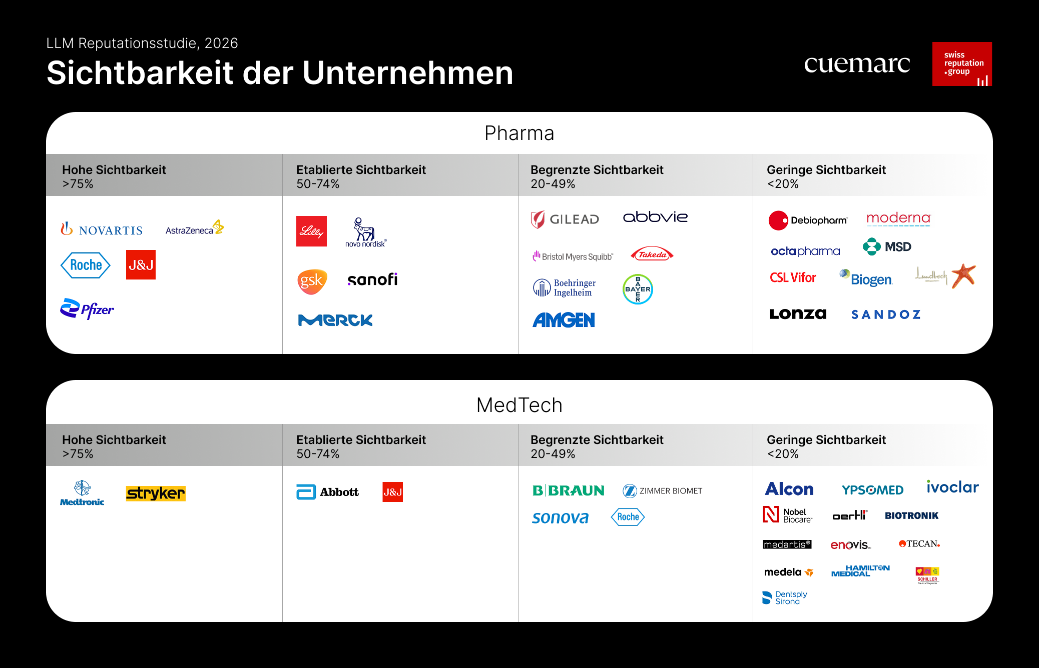 In der Studie wurden im Dezember 2025 über 21 Tage hinweg systematisch Fragen zu Pharma- und MedTech-Unternehmen entlang von sechs Reputationsdimensionen gestellt. Die Auswertung der Konversationen zeigt, wie sichtbar einzelne Unternehmen in ChatGPT-Antworten sind: