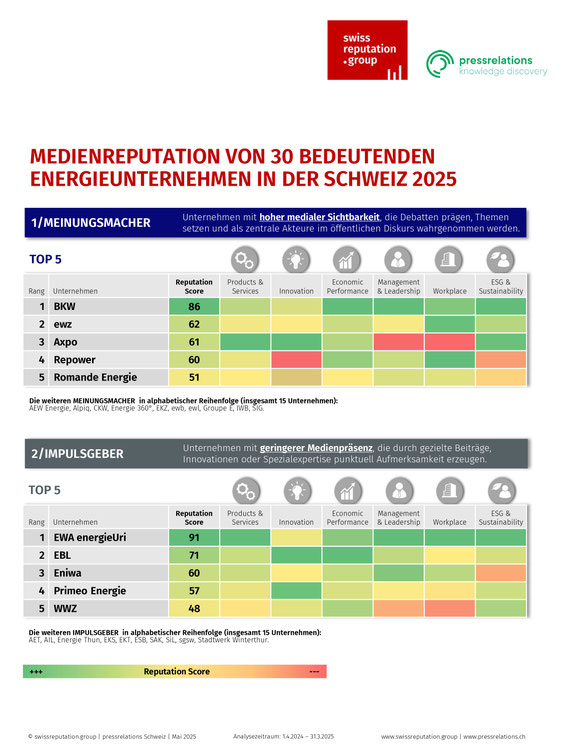 Wir bereits in den beiden Vorjahren hat die BKW mit grossem Abstand die beste Medienreputation der Schweizer Energieunternehmen. Auf den weiteren Plätzen folgen ewz, Axpo, Repower und Romande Energie. In der Gruppe der Impulsgeber - Unternehmen mit geringerer Medienpräsenz - liegt EWA energieUri and der Spitze vor EBL, Eniwa, Primeo Energie und WWZ. Die in Kooperation mit pressrelations Schweiz entstandene Studie wertete mit KI-Unterstützung 38'000 Artikel über 30 bedeutende Energieunternehmen in Schweizer Print- und Onlinemedien aus.