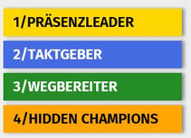 Die nachfolgende Aufstellung zeigt die besten fünf Unternehmen in den vier Präsenzgruppen. Die ausgewiesenen Scores stellen die Mittelwerte aus den sechs Reputationsdimensionen dar.