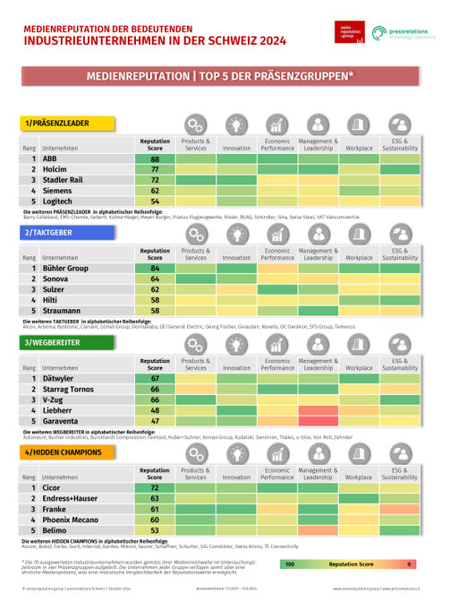 Die swissreputation.group und pressrelations Schweiz legen zum ersten Mal eine umfassende Studie zur Medienreputation der bedeutenden Industrieunternehmen in der Schweiz vor. Grundlage bildeten sämtliche Schweizer Online- und Printmedien, in denen Beiträge von 70 führenden Industriebetrieben mittels einer neuartigen KI-Analysemethodik untersucht wurden. Dabei wurden annähernd 70'000 reputationsrelevante Aussagen identifiziert und bezüglich Thematik und Tonalität bewertet. In den vier Kategorien belegen ABB, Bühler Group, Dätwyler und Cicor die jeweiligen Spitzenplätze.