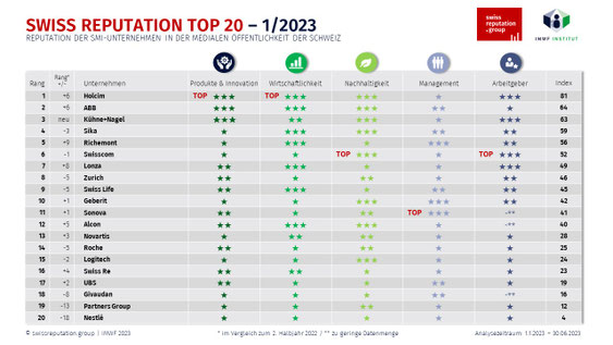 Die SWISS REPUTATION TOP 20 - 1/2023 basiert auf den Daten des 1. Halbjahres 2023.