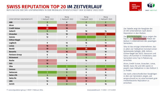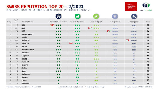 Fünf von sechs SMI-Unternehmen, die bereits im ersten Semester die besten Reputationswerte erreichten, schafften dies auch im zweiten Halbjahr 2023. Dazu gehören Sika, ABB, Kühne+Nagel, Holcim und Swisscom. Zu dieser Spitzengruppe stiess die UBS, die im Nachgang an die Übernahme der Credit Suisse mit grosser medialer Sichtbarkeit punkten konnte. Auf den weiteren Plätzen herrschte viel Bewegung mit zahlreichen Auf- und Absteigern im Halbjahresvergleich. Für die SWISS REPUTATION TOP 20 wurden im zweiten Semester 2023 über 175'000 Aussagen mit KI-unterstützter Textanalyse ausgewertet.